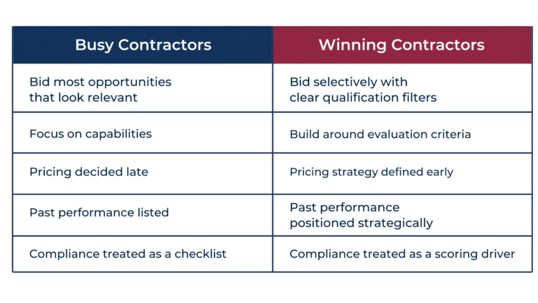 That requires structure in how you qualify opportunities, alignment with evaluation criteria, and a consistent focus on reducing evaluator risk.